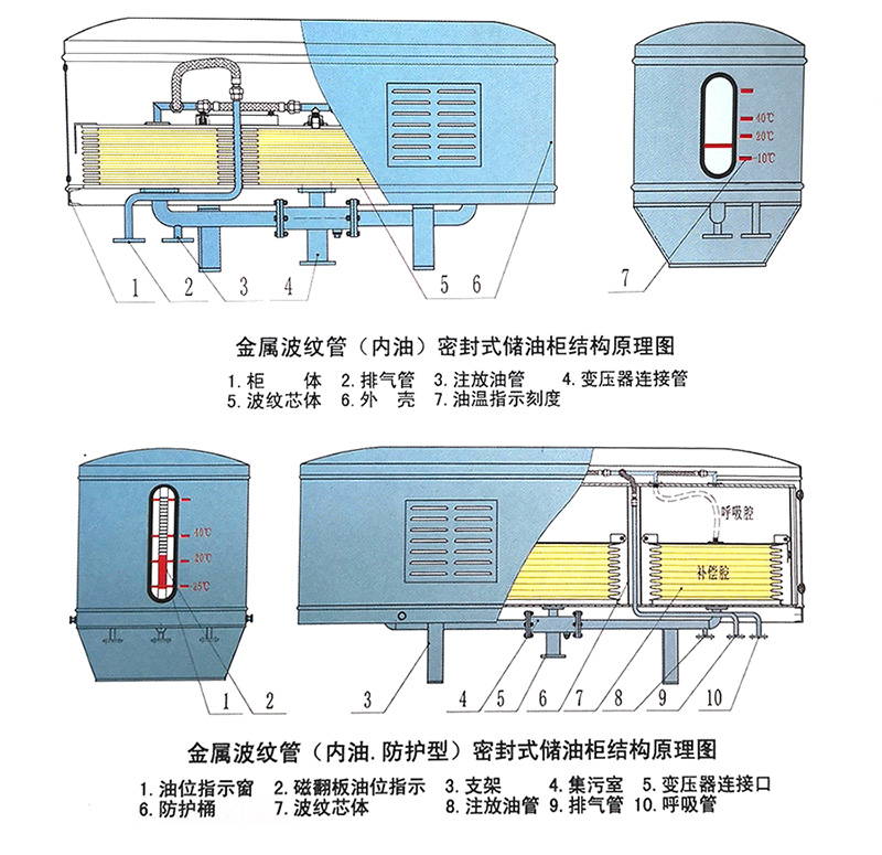 內(nèi)油(防護(hù)型)儲油柜是在內(nèi)油儲油柜的基礎(chǔ)上增加防護(hù)桶,防止儲油柜滲漏影響變壓器正常運(yùn)行,油位指示采用磁翻板。結(jié)構(gòu)及工作原理和外油立式儲油柜類似,只是外油立式儲油柜補(bǔ)償腔在儲油桶內(nèi)側(cè)和芯體波紋管的外側(cè),芯體波紋管內(nèi)為呼吸腔。而內(nèi)油(防護(hù)型)儲油柜芯體波紋管的內(nèi)側(cè)是補(bǔ)償腔,這樣更符合芯體、波紋管作為補(bǔ)償元件的運(yùn)行規(guī)律。能使儲油柜保持微正壓運(yùn)行。