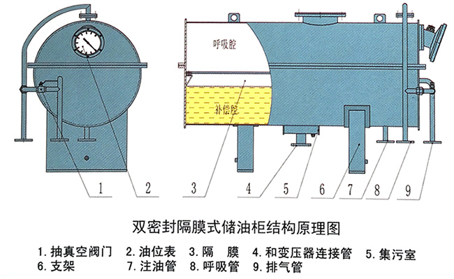 雙密封隔膜儲油柜由兩個半圓組成,下半圓內(nèi)裝有隔膜單獨密封,兩半圓單獨密封,構(gòu)成了雙密封結(jié)構(gòu)。油位指示部分采用油位表指示,同時設有注油、排氣管及抽真空閥門,使結(jié)構(gòu)更加合理,注油、操作更方便。
